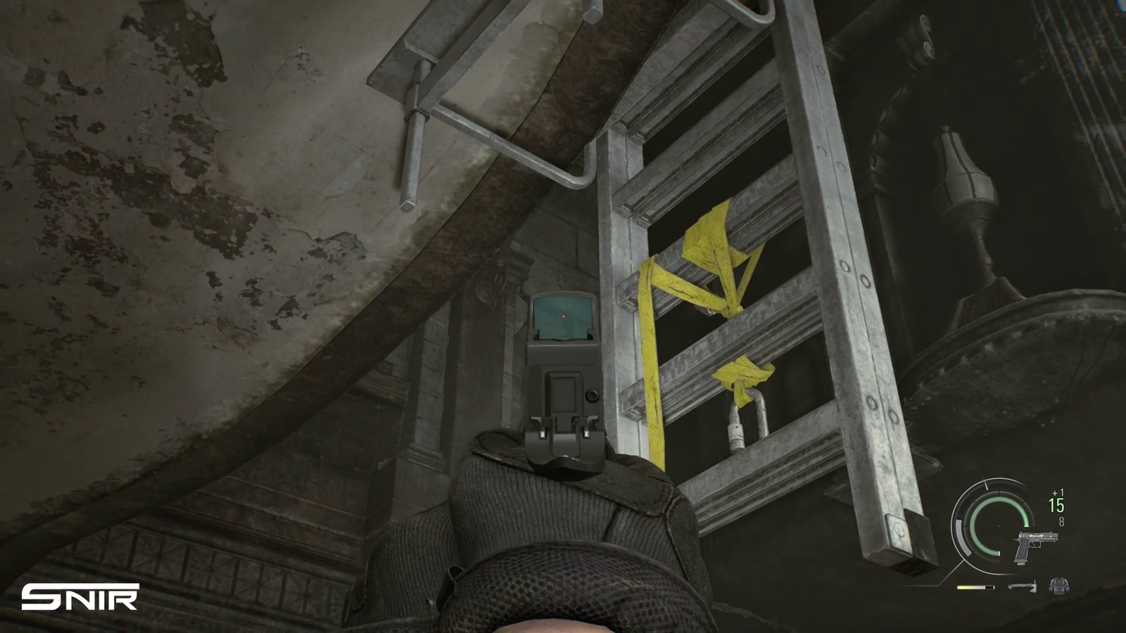 Depuis le hall, partez vers l’ouest par la petite porte. Traversez les bureaux et les couloirs jusqu’à l’échelle, puis tirez dessus pour la débloquer.